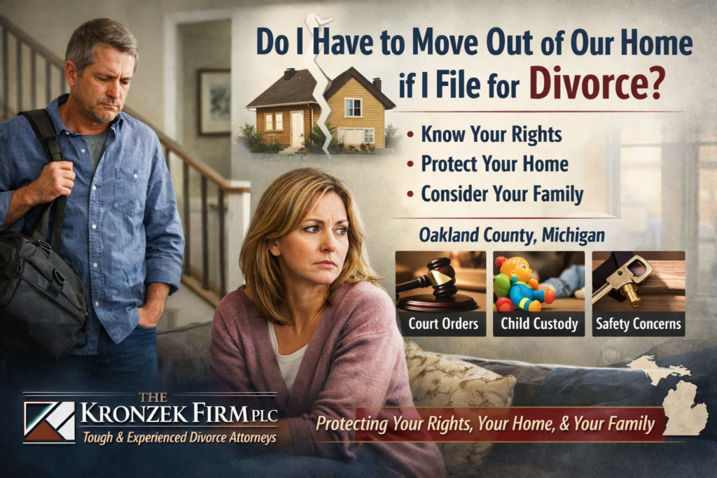 In Michigan, filing for divorce does not automatically require you or your spouse to move out of your home. But if conflict, safety, or practical considerations make cohabitation impossible, a court can intervene to issue a temporary order. At The Kronzek Firm, we understand how uncertain your future looks when divorce becomes part of the equation. One of our experienced family law attorneys can advise you on what is best for your situation. We represent clients in Oakland County and surrounding areas such as Livingston, Macomb, Monroe, and Genesee Counties. The right legal advice can protect your rights, your finances, and your access to your children. The wrong legal advice can haunt you for decades.